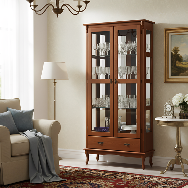 A Cristaleira com Espelho 2 Portas 3 Prateleiras de Vidro 1 Gaveta Pés Luiz XV é uma peça elegante e sofisticada, ideal para exibir suas coleções com estilo. As três prateleiras de vidro e o fundo espelhado criam uma exibição deslumbrante, enquanto as duas portas de vidro protegem seus itens. A gaveta oferece praticidade para armazenamento, e os pés Luiz XV conferem um charme clássico e atemporal. Feita em madeira de alta qualidade, combina beleza, funcionalidade e durabilidade.