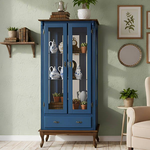 • 01 Cristaleira de Madeira 2 Portas 1 Gaveta 2 Prateleiras Lateral com Vidro Fundo com Espelho Pés Luiz XV