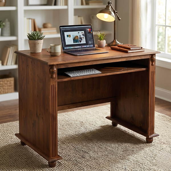 Feita com um acabamento lindo na parte de trás, ela pode ser utilizada como divisora de ambientes. Este modelo pode ser usado também como mesa para computador, pois tem suporte para teclado separado, o que a deixa mais espaçosa e o ambiente mais organizado.