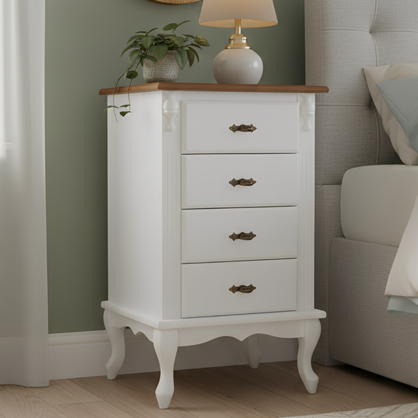 Com detalhes torneados acima dos frisos frontais a peça fica com uma apresentação única, seus pés torneados no estilo Luiz XV, trazem ao criado-mudo uma personalidade única, onde a sua beleza se completa com a variedade de cores que possui. Os puxadores metálicos envelhecidos, ajudam a entregar aquele ar de retrô que todos amam. Uma peça perfeita para ser utilizada no quarto de casal, das crianças e até mesmo dos jovens.