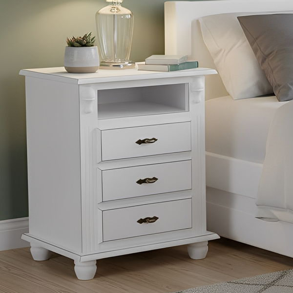• 01 Mesa de Cabeceira com Nicho 3 Gavetas e Pés Torneados