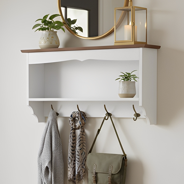 A Prateleira de Madeira Multiuso com Ganchos é perfeita para unir decoração e praticidade em qualquer ambiente da casa. Feita em madeira de qualidade, oferece espaço para organizar objetos decorativos, utensílios ou acessórios, enquanto os ganchos inferiores são ideais para pendurar chaves, bolsas, panos de prato e muito mais. Um toque funcional e charmoso para sua parede.