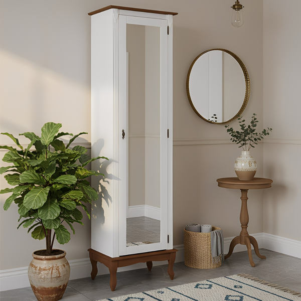 A Sapateira Antique une charme clássico e funcionalidade. Com uma porta, espelho e pés luiz xv, ela oferece elegância e praticidade para organizar seus calçados, além de valorizar a decoração com um toque sofisticado e atemporal.