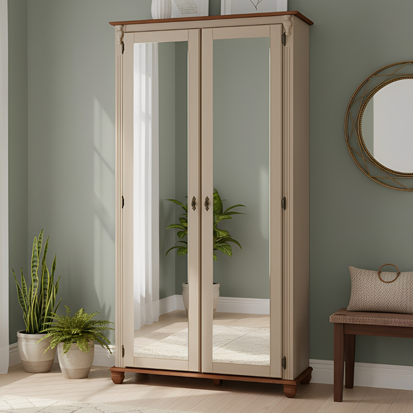 A Sapateira Antique une funcionalidade e elegância clássica em um único móvel. Com duas portas com espelho e pés torneados que remetem ao estilo retrô, ela é perfeita para quem busca organização sem abrir mão do charme na decoração. Seu interior espaçoso permite acomodar diversos pares de sapatos de forma prática e discreta, mantendo o ambiente sempre em ordem. O acabamento delicado e os detalhes em madeira trazem um toque sofisticado e atemporal ao cômodo.