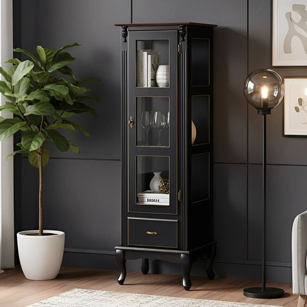 A Cristaleira de Madeira 1 Porta 1 Gaveta 2 Prateleiras Lateral com Vidro Pés Luiz XV 1000 traz um toque de elegância e sofisticação para qualquer ambiente. Com uma porta de vidro, duas prateleiras internas e uma gaveta, oferece espaço de sobra para exibir suas coleções e manter itens pequenos organizados. O detalhe lateral em vidro amplia a beleza dos objetos, enquanto os pés Luiz XV adicionam um charme clássico e atemporal. Feita em madeira de alta qualidade, garante durabilidade e resistência para um uso prolongado.